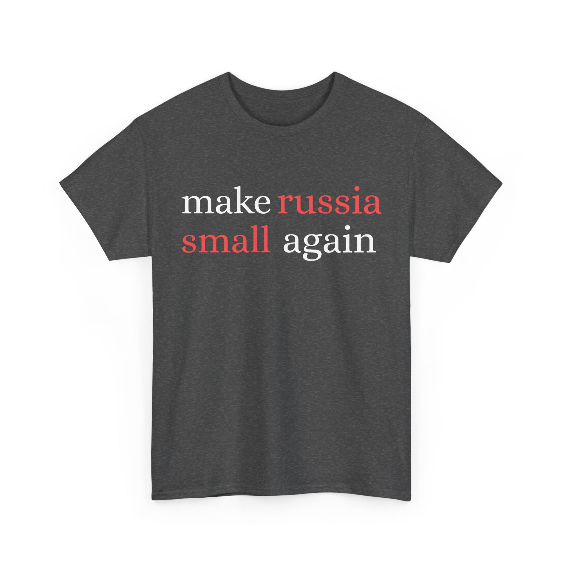 Unser Unisex Heavy Cotton T-Shirt mit dem markanten Aufdruck "Make Russia Small Again" ist ein echter Hingucker und eine stilvolle Art, ein politisches Statement zu setzen. Es ist das perfekte Basic für jede Garderobe, ideal für alle, die ein klares Statement mit ihrer Mode setzen wollen. Die speziell gesponnenen Fasern sorgen für eine glatte Oberfläche, die brillante und scharfe Druckergebnisse ermöglicht, sodass der Aufdruck immer im Fokus steht. Das T-Shirt hat keine Seitennähte, was unangenehme Reibungen unter den Armen verhindert, und die verstärkten Schultern garantieren eine langanhaltende Haltbarkeit.